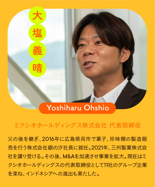 穏やかな瀬戸内海を望む、広島県呉市。この地で祖父が創業した株式会社銀の汐を3代目として承継した大塩義晴さんは、2021年に埼玉県で高級米菓を製造販売する三州製菓株式会社をM&Aで譲り受けた。