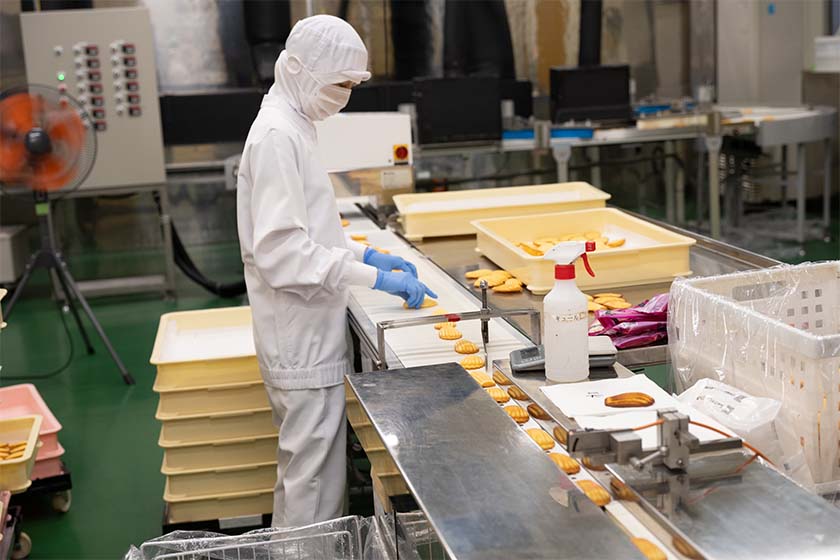 甘い香りが漂う、銀の汐広第一工場。焼菓子が次々に焼かれていく