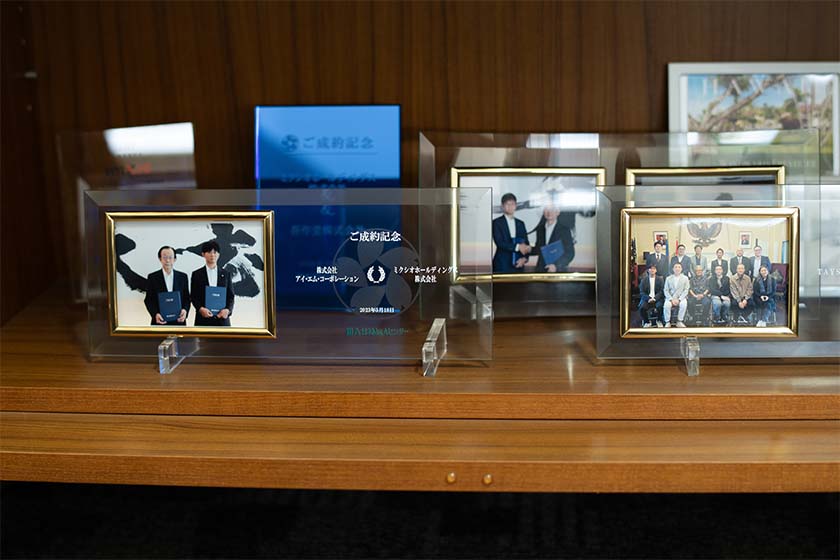 会社の応接室には、M&A成約を記念した写真と盾が並ぶ