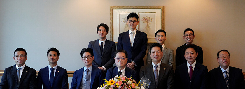 下段、左から3番目より株式会社たから抜型工業 代表取締役社長 石瀬 和文 様、取締役会長 石瀬 文陽 様、 大創株式会社 代表取締役社長 大塚 雅一 様、常務取締役 大塚 徹夫 様