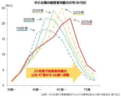 経営者の年齢分布のピークが66歳と引退時期に差し掛かっている中、事業承継において親族内承継から親族外承継へと主流がシフトしつつある現状が明らかになりました。