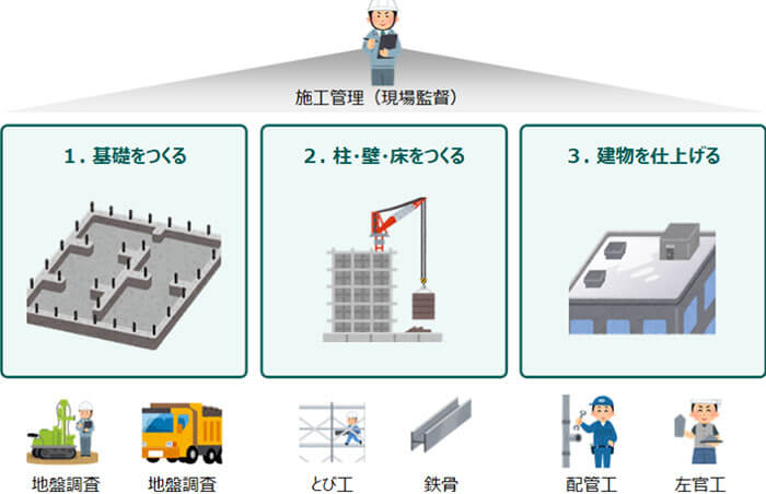 サブコンに仕事を発注しながら建築物や土木工作物を完成させる役割を持っています。