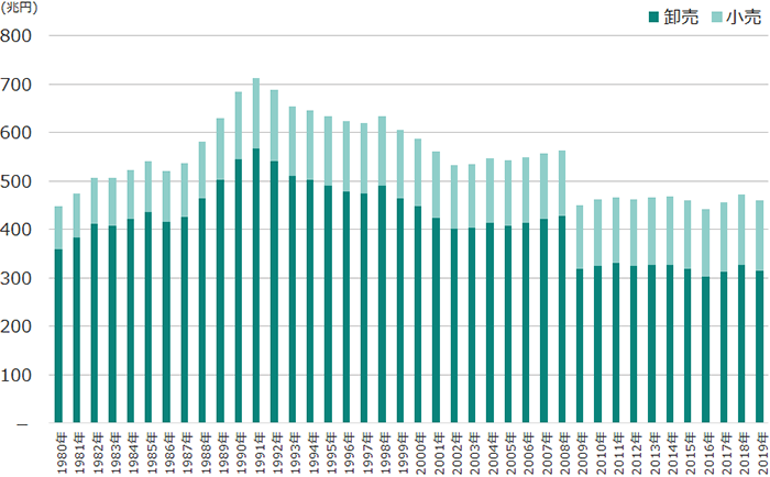2019年の卸・小売業の内訳としては、卸が全体の7割近くを占め315兆、小売は約3割を占め145兆でした。金額だけでシンプルに考えると、卸が販売した商品の約半分が在庫として残っている計算になります。