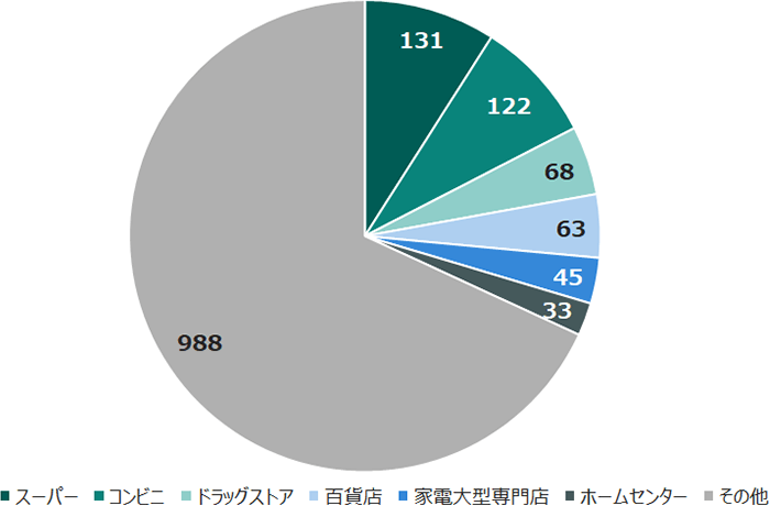 小売業145兆のうち、スーパーが13.1兆、コンビニ12.2兆、ドラッグストア6.8兆、百貨店が6.3兆、家電大型専門店が4.5兆、ホームセンターが3.3兆、その他で98.8兆となります。その他には、主に衣料専門店、自動車小売店(カーディーラー等)、燃料小売店(ガソリンスタンド等)などが含まれています。色々な業種がありますが、やはり一般消費者である私たちが日頃からお世話になるお店が上位に来ていることが分かります。