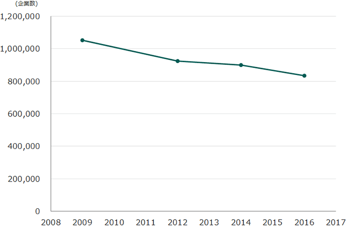 ただし、日本全体の人口減少に伴い、企業数も毎年減少しています。 図5の通り、卸・小売業の企業数(会社も個人事業主も含む)は、2009年の100万社から、2016年には80万社近くまで減少しています。たった7年で20%減です。今後もこの減少傾向は変わらないでしょう。 なお全業界でみると、2016年で358万社のうち83万社が卸・小売業なので、全体の約1/4が卸・小売業といえます。また、83万社のうち卸業は21万社、小売業は62万社で、小売業の方が3倍多いです。これは、日頃私たちが買い物で利用するお店のほとんどが小売業であることからも、イメージできるかと思います。