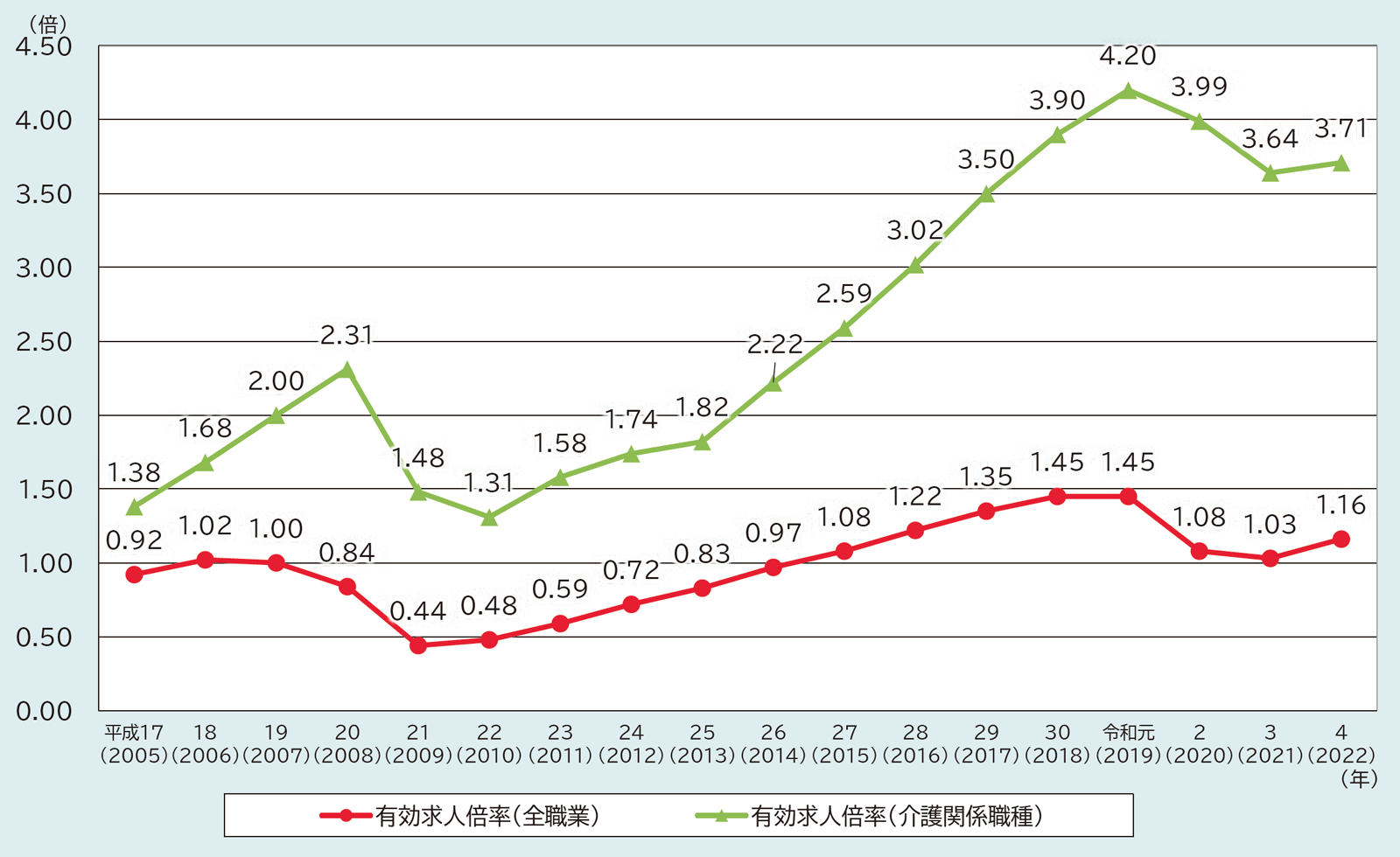 出典:厚生労働省「介護サービス施設・事業所調査」(介護職員数)、「介護保険事業状況報告」(要介護(要支援)認定者数)