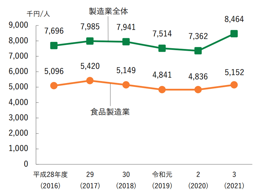 このような特性から、食品製造業はほかの製造業に比べ、生産性が低い傾向にあります。