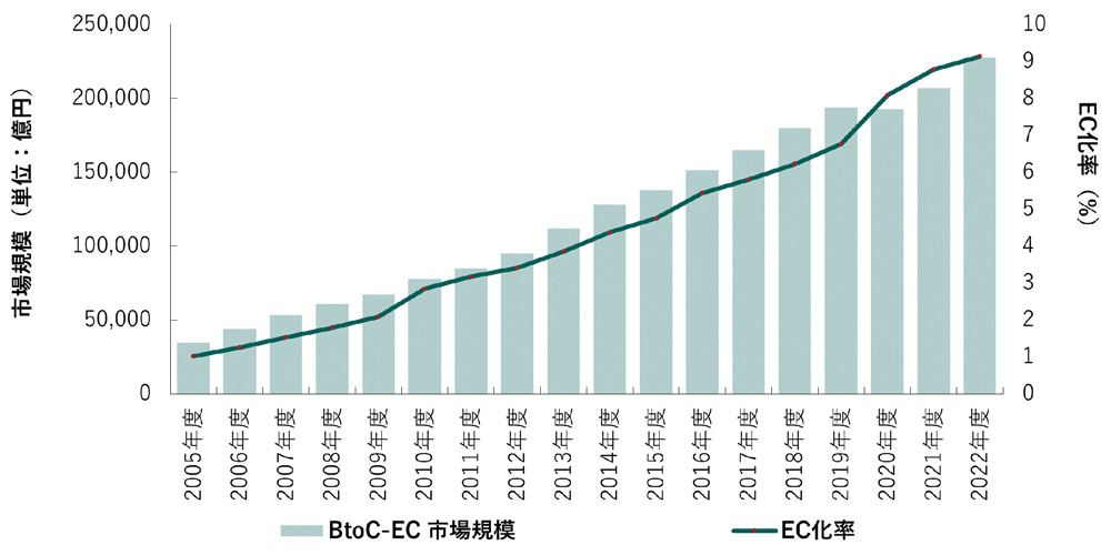 物販系分野におけるEC化率は年々ゆるやかに増加しており、前述の経産省調査では、2022年には全体で9.13%となりました。