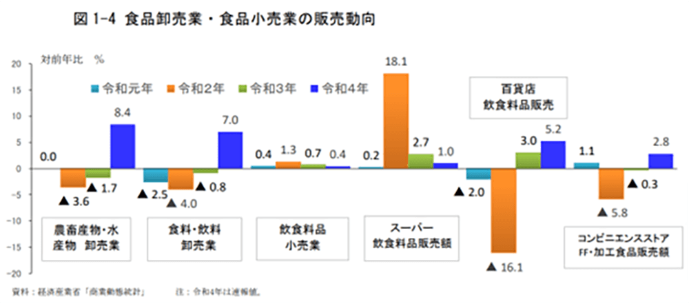 2022 年の農畜産物・水産物卸売業及び食料・飲料卸売業の販売額は、それぞれ対前年比 8.4%、7.0%とかなりの程度増加し、コロナ禍以前の2019年の水準に回復しつつあります。同年の飲食料品小売業販売額は、対前年比 0.4%と前年並みとなり、2019年と比べてわずかに増加。このうち、巣ごもり需要で好調だったスーパーは、2019年と比べて大幅な増加となりましたが、百貨店やコンビニエンスストアは前年からやや増加したものの、コロナ禍以前の水準までには回復しきっていない状態です。