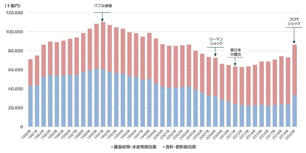 食品卸業界は、外部環境の変化に直面しています。小売業を中心とした業界再編の影響や小売業のPB品強化による収益の低迷、人口減少に伴う売上の減少などがその主な要因です。これにより、上場企業であっても収益性に苦しむ現実があります。一方で、食品卸業界全体の市場規模は、インバウンド需要やコロナ禍による内需の増加などにより2020年には回復傾向を見せましたが、収益性の向上が依然として難しい状況です。