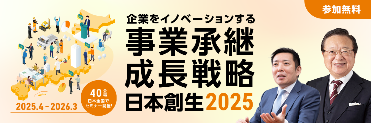 - 2025年開催の「企業をイノベーションする事業承継・成長戦略 ~日本創生2025~」の開催済みセミナーをご覧いただけます。