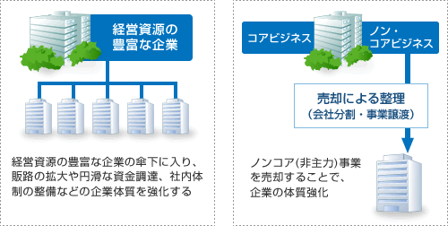 M&Aで上場企業など経営資源の豊富な企業のグループに加わることにより、販路の拡大・円滑な資金調達など、自社の弱点を補うことができ、企業体質の強化を実現できます。