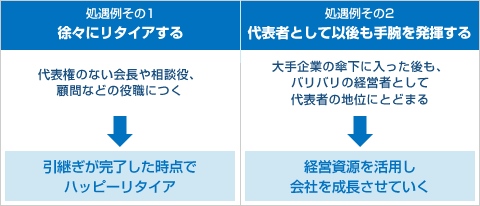 一方で、大手企業の傘下に入った後も代表者の地位にとどまり、譲受け企業の経営資源を活用することにより成長を加速させている代表者の方も少なくありません。