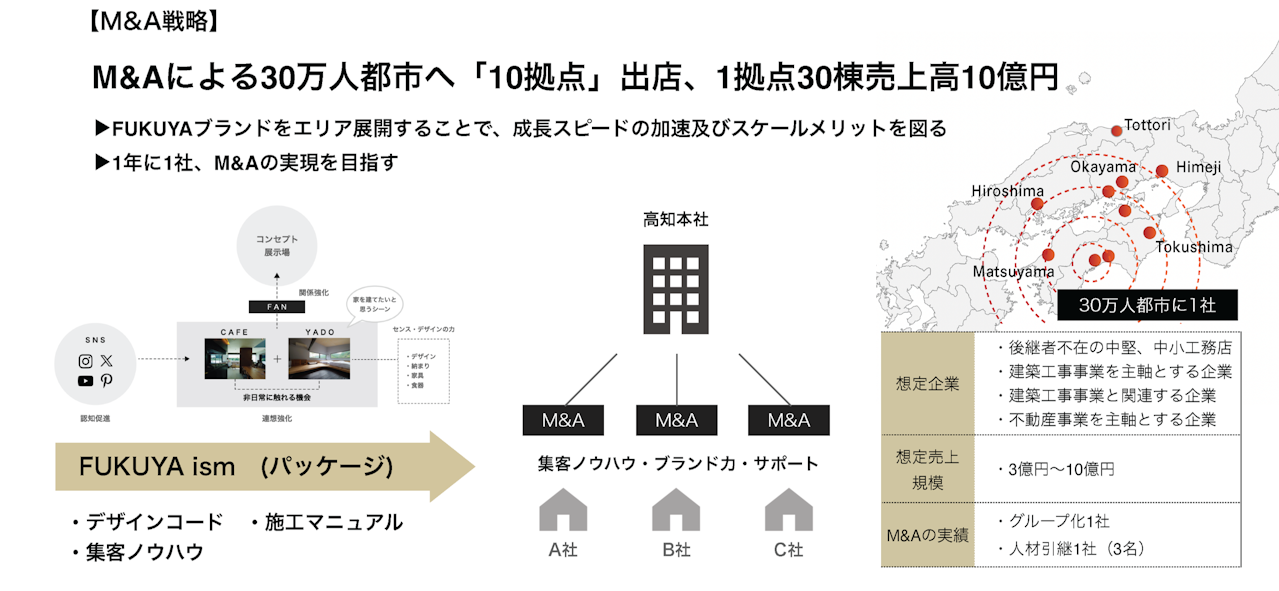 また、上場後のさらなる成長に向けた今後の戦略として、後継者不在の中堅中小工務店や建設工事・建築工事・不動産会社を対象に1年に1社のM&Aの実現を目指し、松山・徳島・岡山・広島・姫路等、高知周辺の30万人都市へ10拠点を出店していきたい、とお話されていました。
