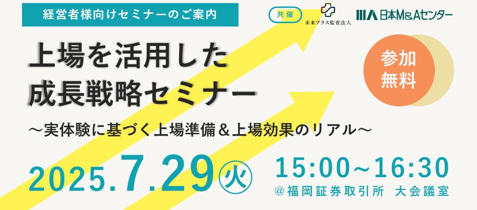 この度日本M&Aセンターでは、未来プラス監査法人と共催で、セミナー『上場を活用した成長戦略セミナー ~実体験に基づく上場準備&上場効果のリアル~』を2025年7月29日(火)15:00~16:30に開催いたします。