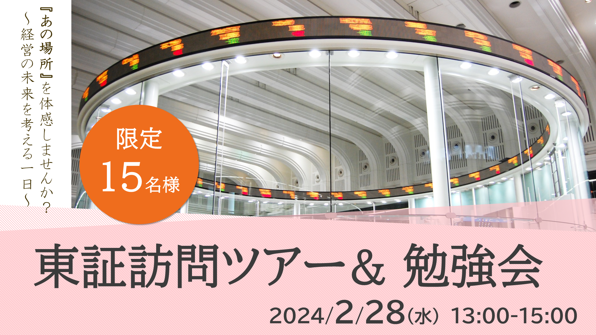この度日本M&Aセンターでは、株式会社東京証券取引所/日本取引所グループの後援のもと、株式上場に興味関心のある企業を対象とした限定イベント「東証訪問ツアー&勉強会」の第三回を2024/2/28(水) に開催いたします。