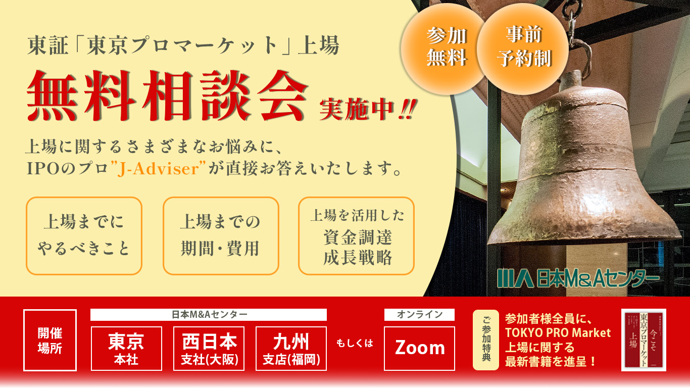 現在日本M&Aセンターでは、TOKYO PRO Market上場に関するあらゆるご質問や、上場を活用した経営戦略のご相談などについて、J-Adviserを務める当社IPOコンサルタントがマンツーマンでお話しをお受けする、『東証「東京プロマーケット」上場のための無料相談会』を開催しております。