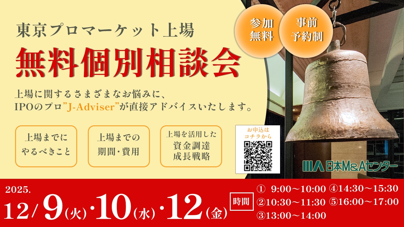TOKYO PRO Market上場に関するあらゆるご質問や、上場を活用した経営戦略のご相談などについて、J-Adviserを務める日本M&AセンターのIPOコンサルタントがマンツーマンでお受けする『東京プロマーケット上場のための無料個別相談会』を、2025年12月9日(火)・10日(水)・12日(金)の3日間限定で開催いたします。
